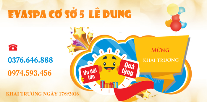 Là một trung tâm làm đẹp uy tín tại Thanh Hóa, Eva spa hiện đang là thương hiệu chăm sóc sắc đẹp được rất nhiều quý khách hàng yêu mến và ghé thăm. Bằng sự tin yêu đó và mở rộng dịch vụ trong cả nước nói chung và trong tỉnh nói riêng, Eva Spa CS5 - Lê Dung Thanh Hóa đã được chính thức thành lập, đi vào hoạt động. Nhân dịp khai trương. Eva Spa CS5 - Lê Dung Thanh Hóa dành tặng quý khách hàng chương trình GIẢM GIÁ SỐC - SIÊU KHUYẾN MÃI như sau: