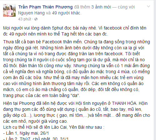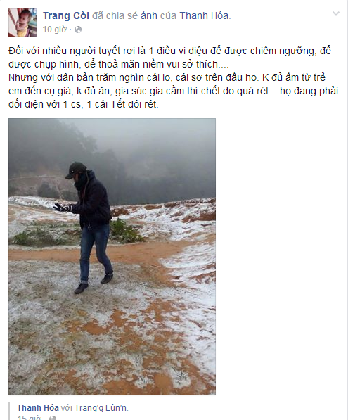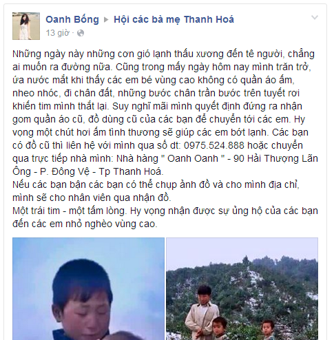 Sáng hôm nay 25/01/2016. Thời tiết tại Thanh Hóa có vẻ như đã tăng lên một chút nhưng cái giá vẫn còn, đủ để mọi người cảm nhận được và khi đi ngoài đường đều phải mặc đủ ấm. Nhưng niềm vui với admin không chỉ là thời tiết ấm lên một chút, mà lướt qua 1 hồi facebook admin cảm nhận được tình đồng cảm, tình yêu thương giữa con người miền xuôi, dành tặng cho những người khó khăn miền ngược trong dịp thời tiết bất thường những ngày sát tết âm lịch 2016. Liên tiếp và hàng dài những dòng chia sẻ, những lời kêu gọi quyên góp quần áo ấm, những STT cảm động của gia đình facebook gửi đến những trường hợp khó khăn thuộc vùng cao Thanh Hóa. Mỗi Bạn là một cách cảm thông khác nhau, có thể chỉ là tinh thần, có thể là những món quà vật chất, hay đơn giãn chỉ là những cái ấn chuột chia sẻ, like bài viết ... Nhưng tất cả điều đó đều vì tình thương cảm dành cho người nghèo vùng cao, giúp mọi người biết đến nhiều hơn nữa, đâu đó quanh ta đang có rất nhiều những mảnh đời bất hạnh đang phải trãi qua cái rét đến thấu xương thịt những ngày sát tết.